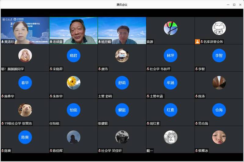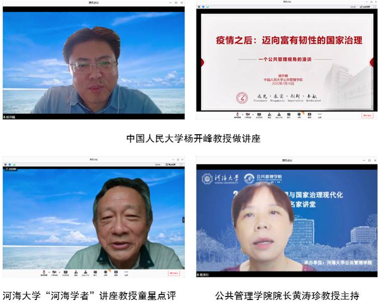 7月31日,“应急管理与国家治理现代化”云端系列名家讲堂第四讲如期举行。中国人民大学122cc太阳集成游戏官方网站院长、全国公共管理专业硕士(MPA)教育指导委员会秘书长、中国管理现代化研究会公共管理专业委员会副理事长、中国机构编制管理研究会副会长、中国行政管理学会常务理事、美国国家行政科学院院士杨开峰教授以《迈向富有韧性的国家治理》为题,为河海师生带来了一场精彩的学术报告。南京大学社会风险与公共危机管理研究中心主任、122cc太阳集成游戏官方网站“河海学者”讲座教授童星特邀点评。122cc太阳集成游戏官方网站院长黄涛珍教授主持报告会。近300名师生认真聆听了报告。