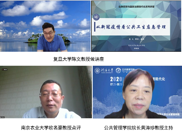 8月13日,“应急管理与国家治理现代化”云端系列名家讲堂第九讲如期举行。复旦大学医院管理研究所副所长、国务院学位委员会公共管理学科评议组成员、中国卫生经济学会医疗保险专业委员会副主任委员、中国医疗保险研究会常务理事、复旦大学公共卫生学院陈文教授以《从新型冠状肺炎疫情看公共卫生应急管理》为题,为河海师生带来了一场精彩的学术报告。南京农业大学欧名豪教授特邀点评。122cc太阳集成游戏官方网站院长黄涛珍教授主持报告会。200余名师生认真聆听了报告。