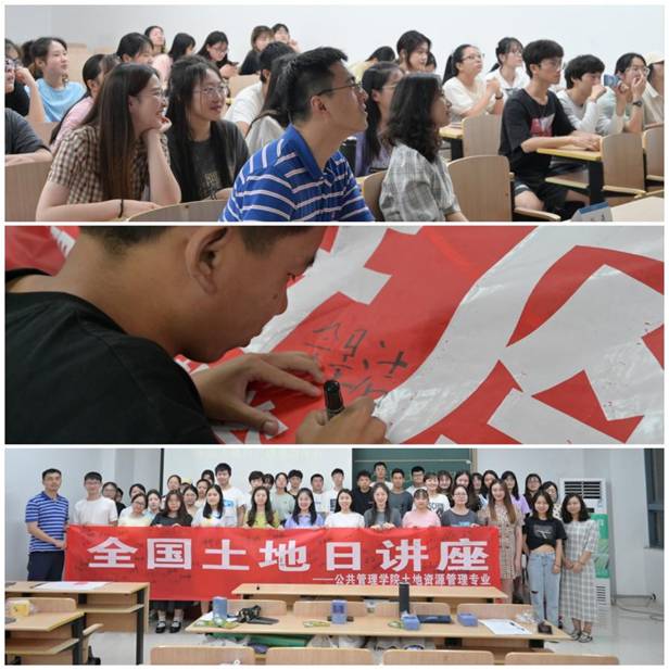 制作了土地日宣传视频,在新食堂三楼的大屏幕上循环播放,制作土地日宣传横幅,悬挂在西操场。6月24日开展讲座,邀请了袁源老师和孙燕老师作为嘉宾,袁源向同学们介绍了国土空间规划战略意义,孙燕讲解了国土空间规划体系与设计,与同学们进行热烈地交流与讨论。通过该讲座同学们对土地的相关知识了解更加深入,既增强了专业信心,又提升了学习的兴趣,收获满满。其次开展有奖竞答环节,四队学生参加,竞赛中同学们查漏补缺、互相学习。最后,所有老师和同学在横幅上留下了自己的名字,在明信片上写上了活动感想,纪念本次有特殊意义的全国土地日。
