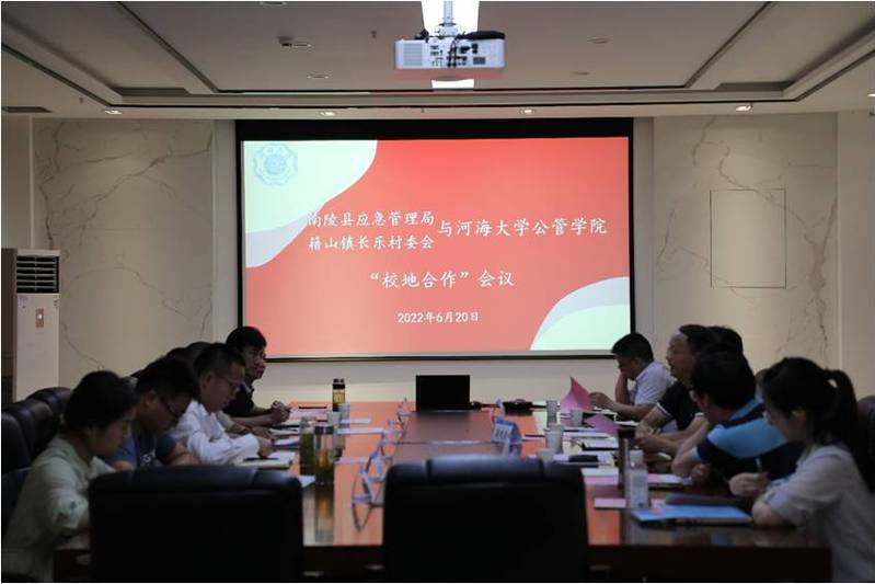 2022年6月20日上午,安徽省南陵县应急管理局、南陵县籍山镇长乐村委会与122cc太阳集成游戏官方网站“校地合作”会议在122cc太阳集成游戏官方网站江宁校区厚学楼401举行。122cc太阳集成游戏官方网站党委书记蒲晓东、122cc太阳集成游戏官方网站副院长陈涛教授、社会学系主任顾金土教授、行政管理系主任曹海林教授、行政管理系副主任李智副教授、社会学系薛芳璿博士以及芜湖市政法委三级调研员兼籍山镇长乐村党委第一书记/驻村工作队队长邢毅、南陵县应急管理局副局长张旭峰、籍山镇长塘村党总支第一书记张晶、南陵县籍山镇长乐村委会主任汪富、籍山镇长乐村驻村工作队副队长陈修原等出席本次会议。会议由122cc太阳集成游戏官方网站副院长陈涛教授主持。