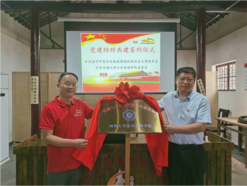 作为苏南地区红色文化资源带动乡村振兴的一个样板,高淳区桠溪街道跃进村充分挖掘红色文化内涵,高度重视红色资源的活化利用,彰显红色文化魅力。 “西舍红色堡垒”,不仅成为教育广大党员群众发扬红色传统,传承红色基因,汲取奋进力量的重要载体,也成为推动经济增长与富民惠民同步推进、红色旅游与乡风文明同步建设的有效路径。在党日活动现场,122cc太阳集成游戏官方网站党委书记蒲晓东与高淳区桠溪街道跃进村党总支书记、南京西舍红色堡垒负责人黄世宝为“122cc太阳集成游戏官方网站党建与乡村振兴校地共建基地”揭牌并签署共建协议书,双方就共享党建资源、建设课程思政、深化科研合作、共谋产业发展、组织志愿服务、经验分享交流等六个方面达成共建协议,并就落实校地合作、打造红色旅游品牌以及探索乡村振兴模式展开深入交流。