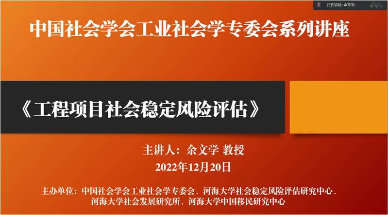 2022年12月20日,“中国社会学会工业社会学专业委员会系列”系列报告暨河海公管大讲堂以腾讯会议的形式举行。工业社会学专业委员会第三届副理事长、122cc太阳集成游戏官方网站余文学教授应邀作了题为“工程项目社会稳定风险评估”的学术报告。