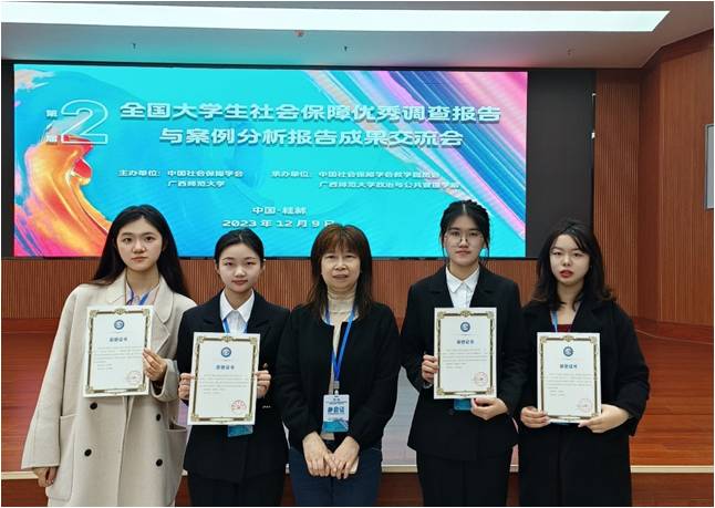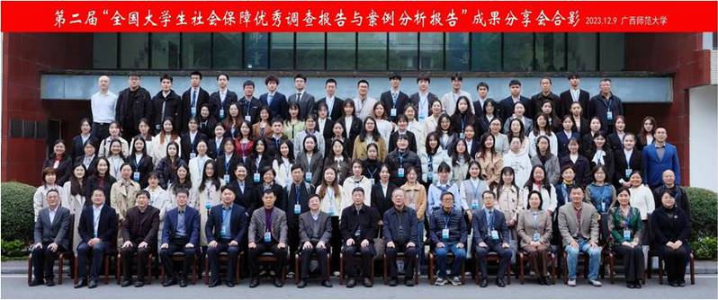 2023年12月9日,响应党中央有关大兴调查研究之风的要求,为促进社会保障学科发展,由中国社会保障学会、广西师范大学主办,中国社会保障学会教学委员会、广西师范大学政治与122cc太阳集成游戏官方网站承办的第二届“全国大学生社会保障优秀调查报告与案例分析报告成功分享会”在广西师范大学成功举办。太阳集成官网社会保障系主任韩振燕教授、劳动与社会保障专业2021级本科生陈莉、吴佳斌、邓美玉和数学学院闵芷瑞同学应邀前往广西师范大学参加会议。
