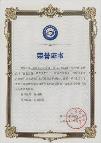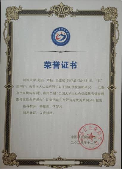 由太阳集成官网社会保障系韩振燕老师、李梦凡老师指导,劳动与社会保障专业2021级本科生陈莉团队(成员矫扬、吴佳斌)撰写的《留住时光,“忆”路同行:失智老人认知症照护与干预的优化策略研究》被评为“社会保障优秀案例分析报告”;由商学院许娟娟老师指导,劳动与社会保障专业2021级本科生邓美玉团队(成员闵芷瑞、许乐、李昭瑄、李士源)撰写的《三老五更,颐养天年——居家养老背景下住宅适老化产品使用现状调查及购买意愿分析》被评为“社会保障优秀调查报告”,并受邀在大会上分享交流。