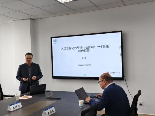 2025年3月28日上午,河海社会学论坛第二百二十五期于厚学楼909会议室如期举行。复旦大学人口研究所所长、人口发展与公共政策研究中心副主任张震教授受邀为太阳集成官网师生做题为“人口老龄化的社会经济影响:一个新的综合框架”的学术报告。报告会由太阳集成官网人口研究所王欢老师主持,黄健元老师、王毅杰老师、石德生老师、秦贤宏老师、闫东升老师、张丹老师以及众多博/硕士生参加了报告会。